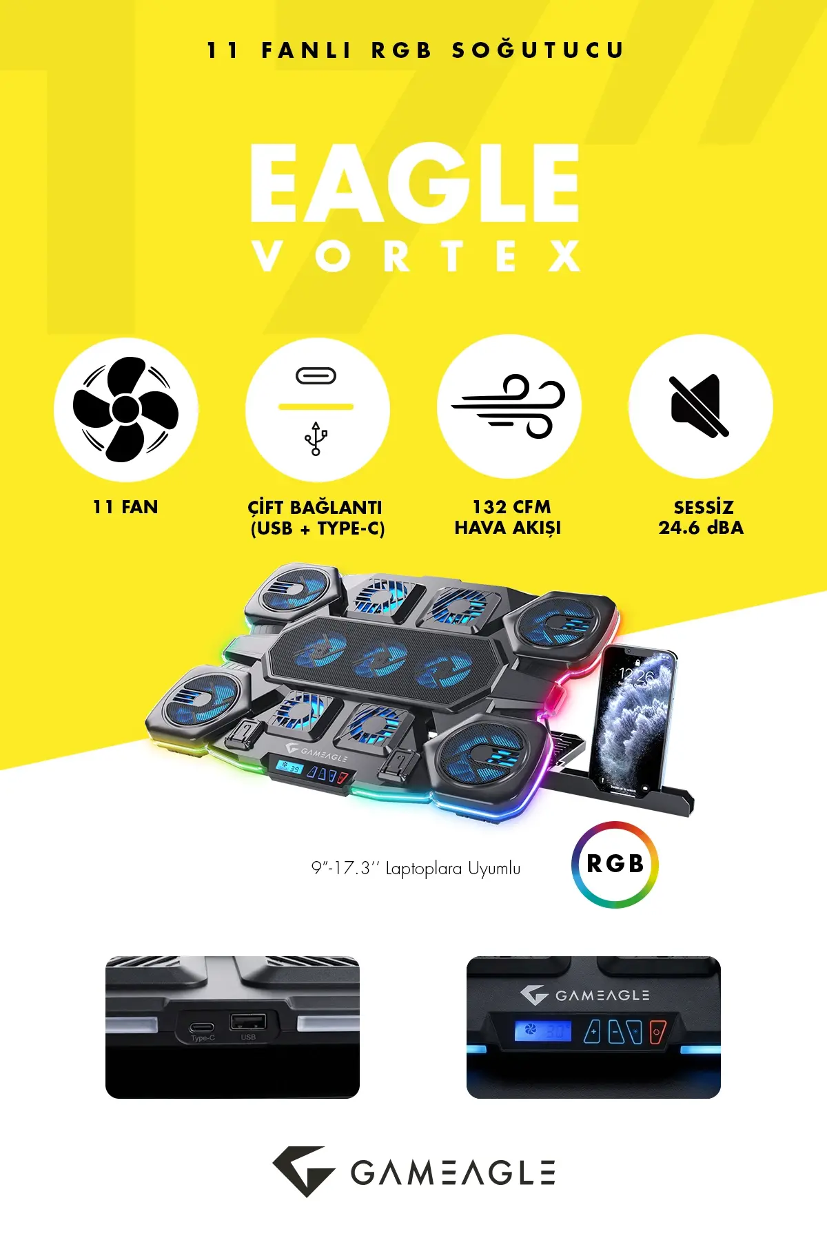 Gameagle Eagle Vortex K11 RGB 11 Fanlı 10 RGB Modlu 9-17.3'' Notebook Soğutucu Stand Laptop Soğutucu
