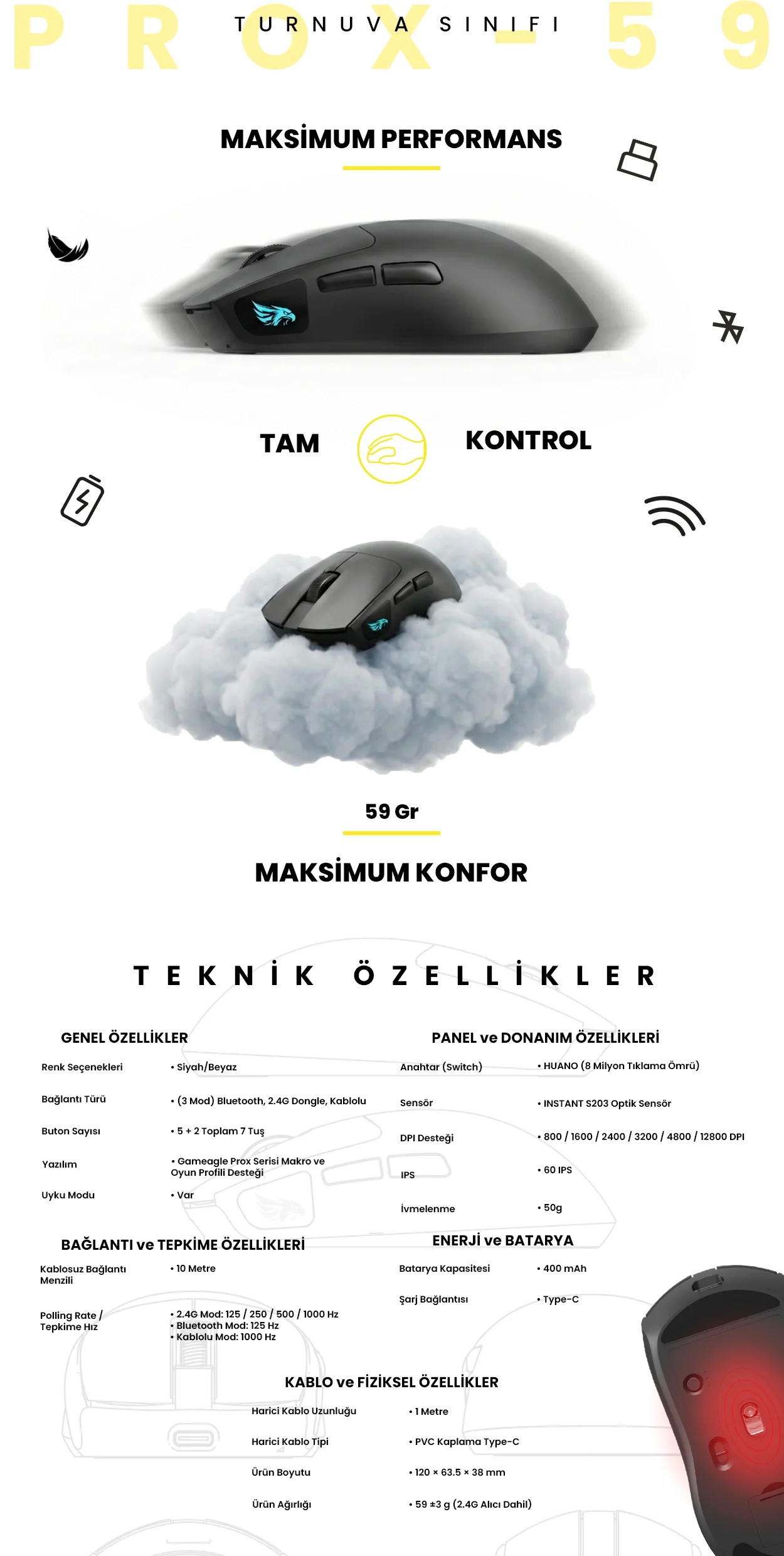 Gameagle PROX-59B Serisi Hafif Kablosuz 3 Mode Oyuncu Gaming Optik Mouse (Siyah)