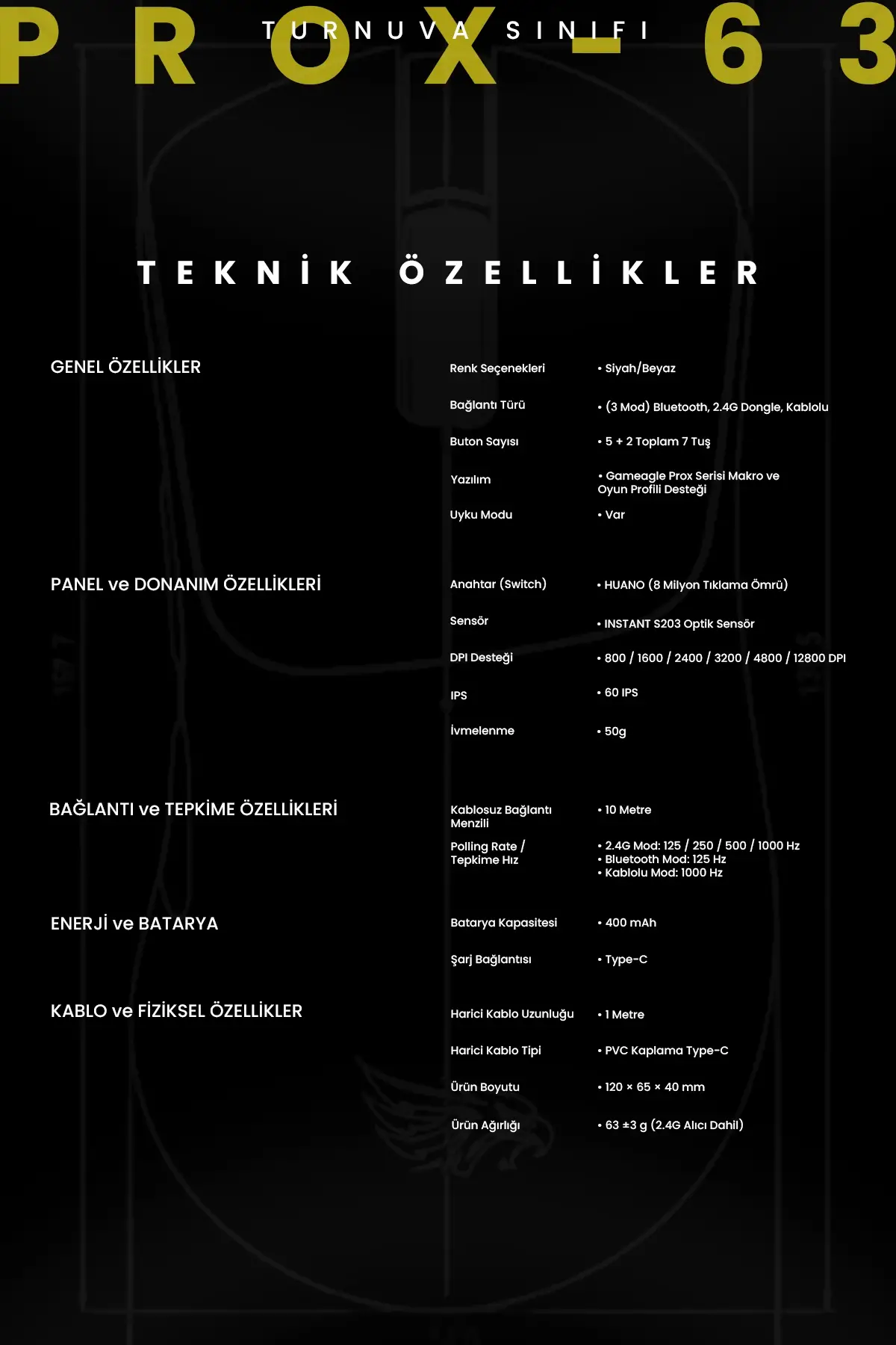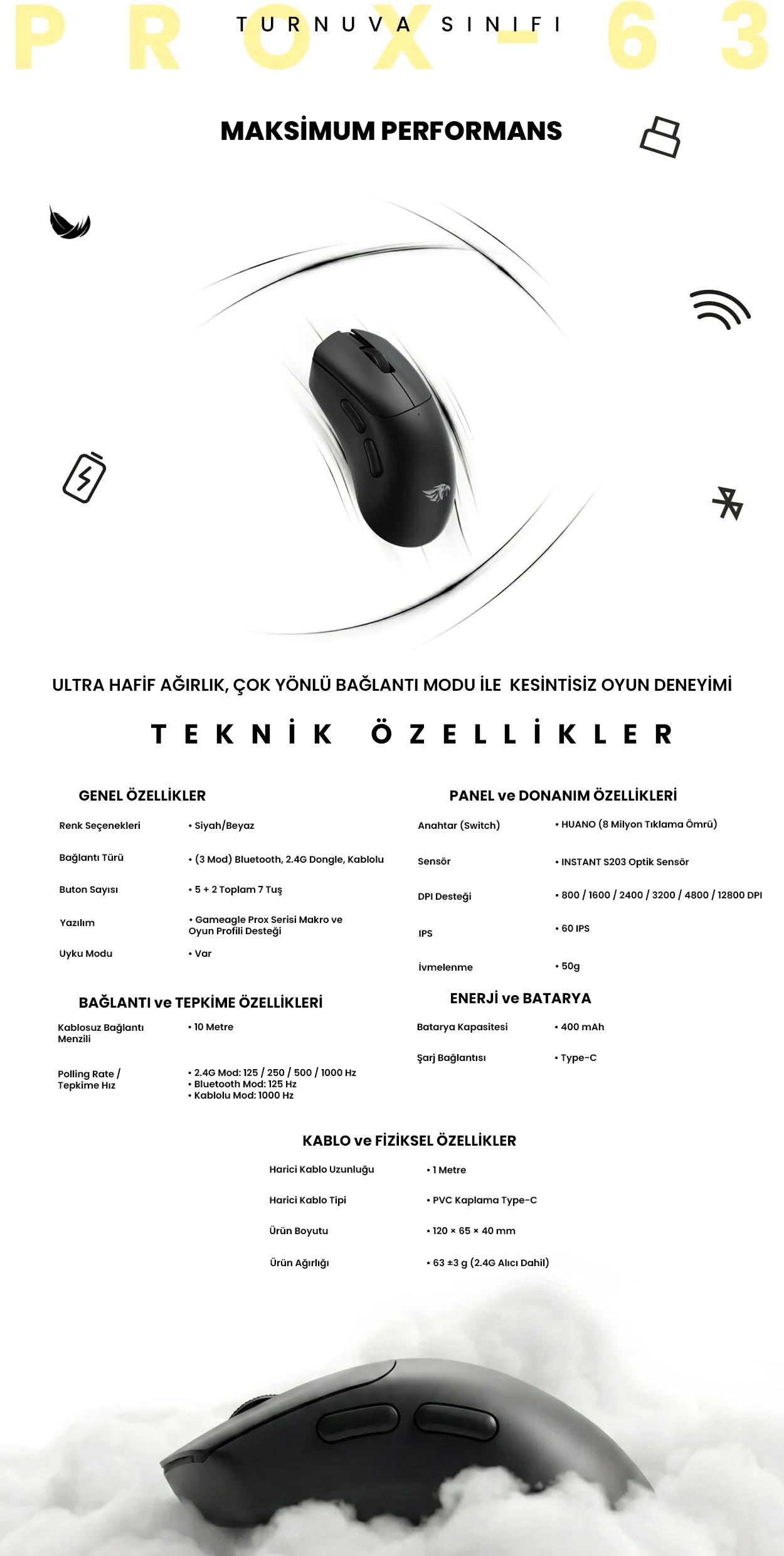 Gameagle PROX-63B Serisi Hafif Kablosuz 3 Mode Oyuncu Gaming Optik Mouse (Siyah)